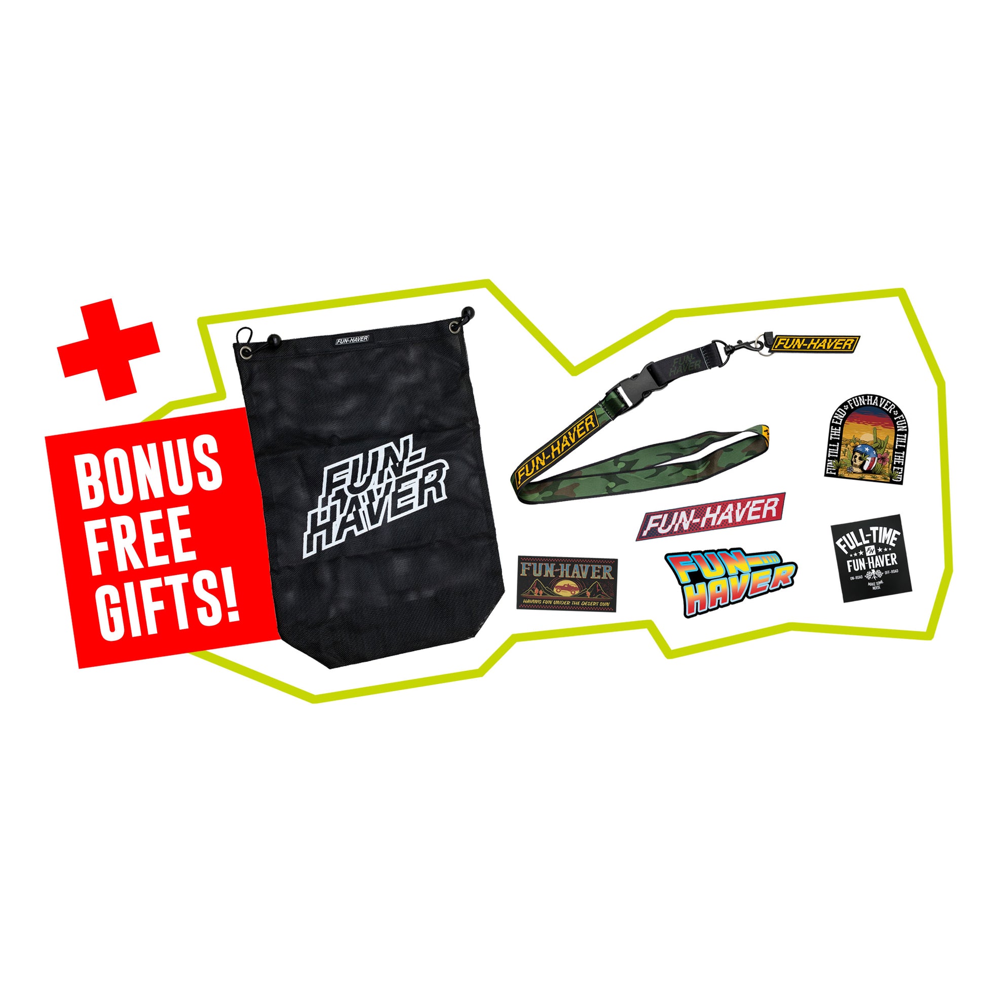 Fun-Haver® Trail Bag (9.5 gallon capacity) in Black, Fun-Haver® Camo Lanyard w/Buckle, Fun-Haver® Logo Keychain, Fun-Haver® Foundation Sticker, Fun-Haver® Full Time Fun-Haver® Sticker, Fun-Haver® Desert Fun Sticker, Fun-Haver® Desert Scene Sticker,Fun-Haver® Outta Time Sticker!