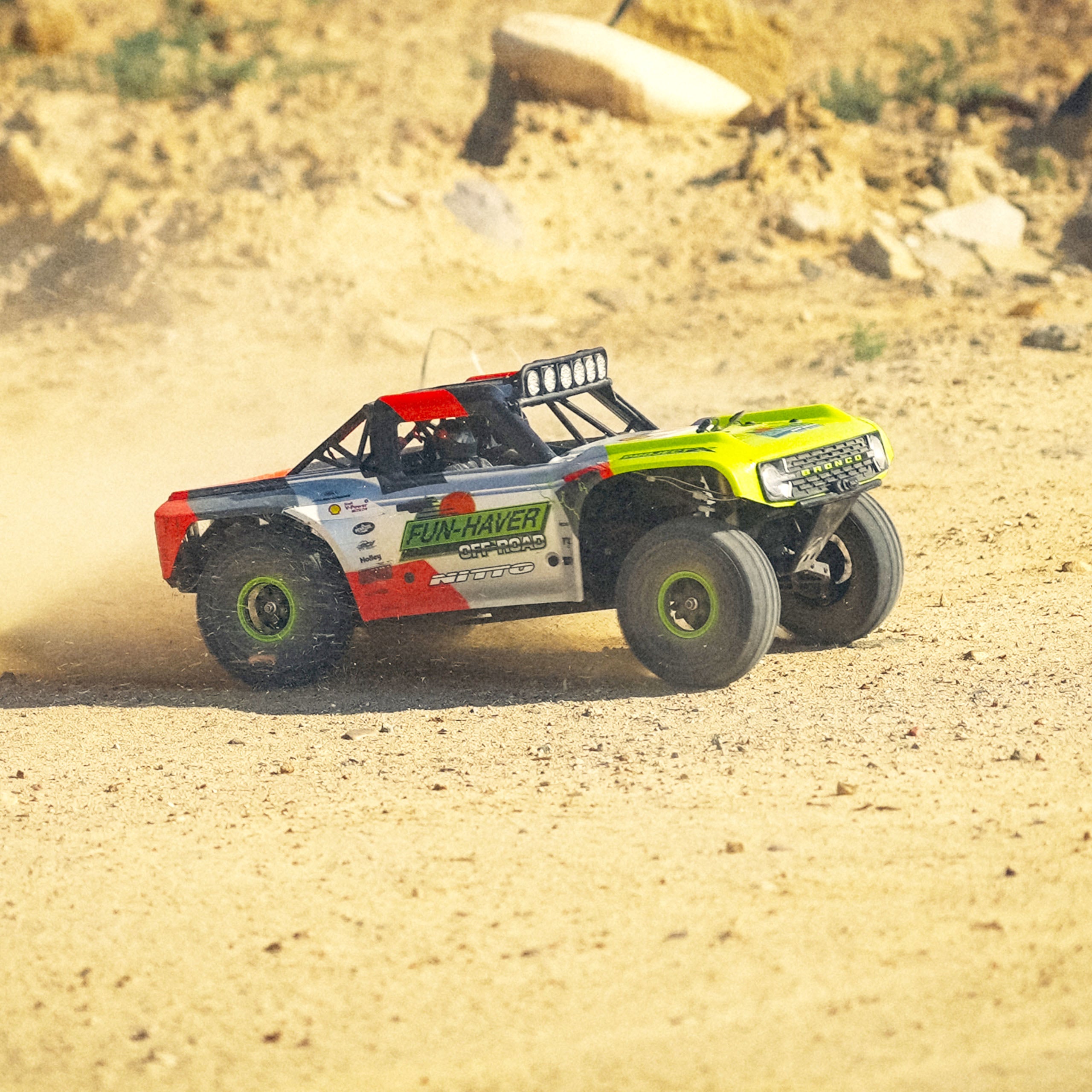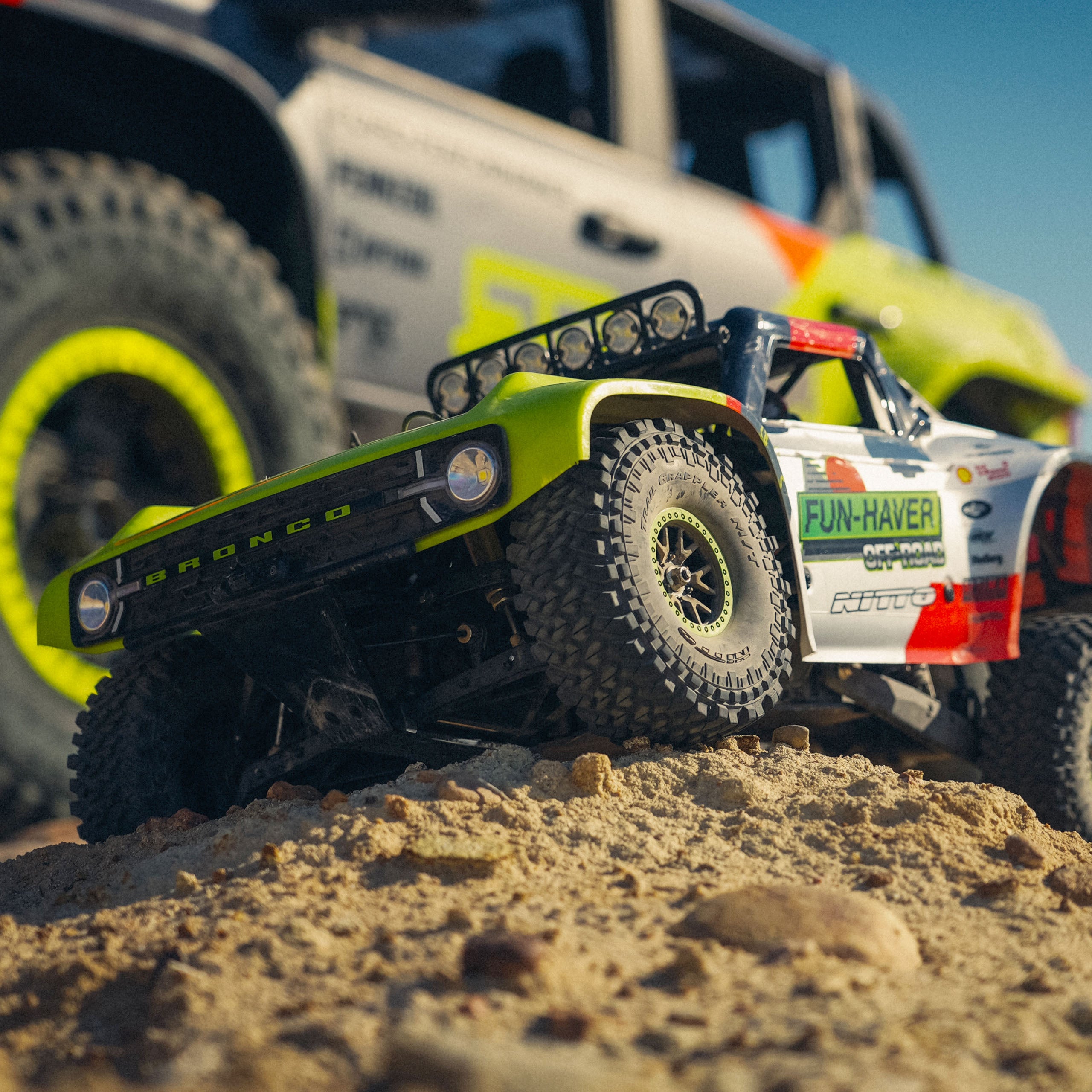 Introducing the 1:7th Scale Fun-Haver® Ford Bronco RC Truck! Officially licensed by Ford and RTR Vehicles. This is a 1:7th large scale replica (25" long) of our full-sized Fun-Haver® Bronco that dominates Ultra4 racing, this RC truck captures the spirit of off-road racing with bold design and rugged authenticity. From desert runs to rocky trails, it channels the full-size thrill into a compact, high-performance RC truck — faithfully capturing the spirit of the original and inviting you to explore the wild, one trail at a time.