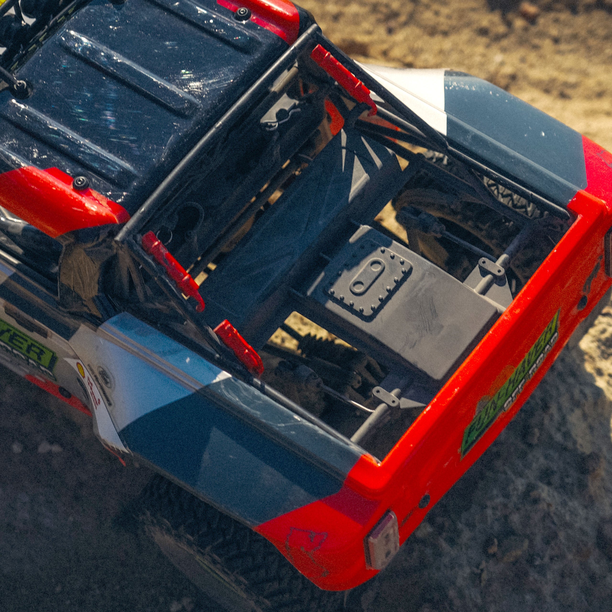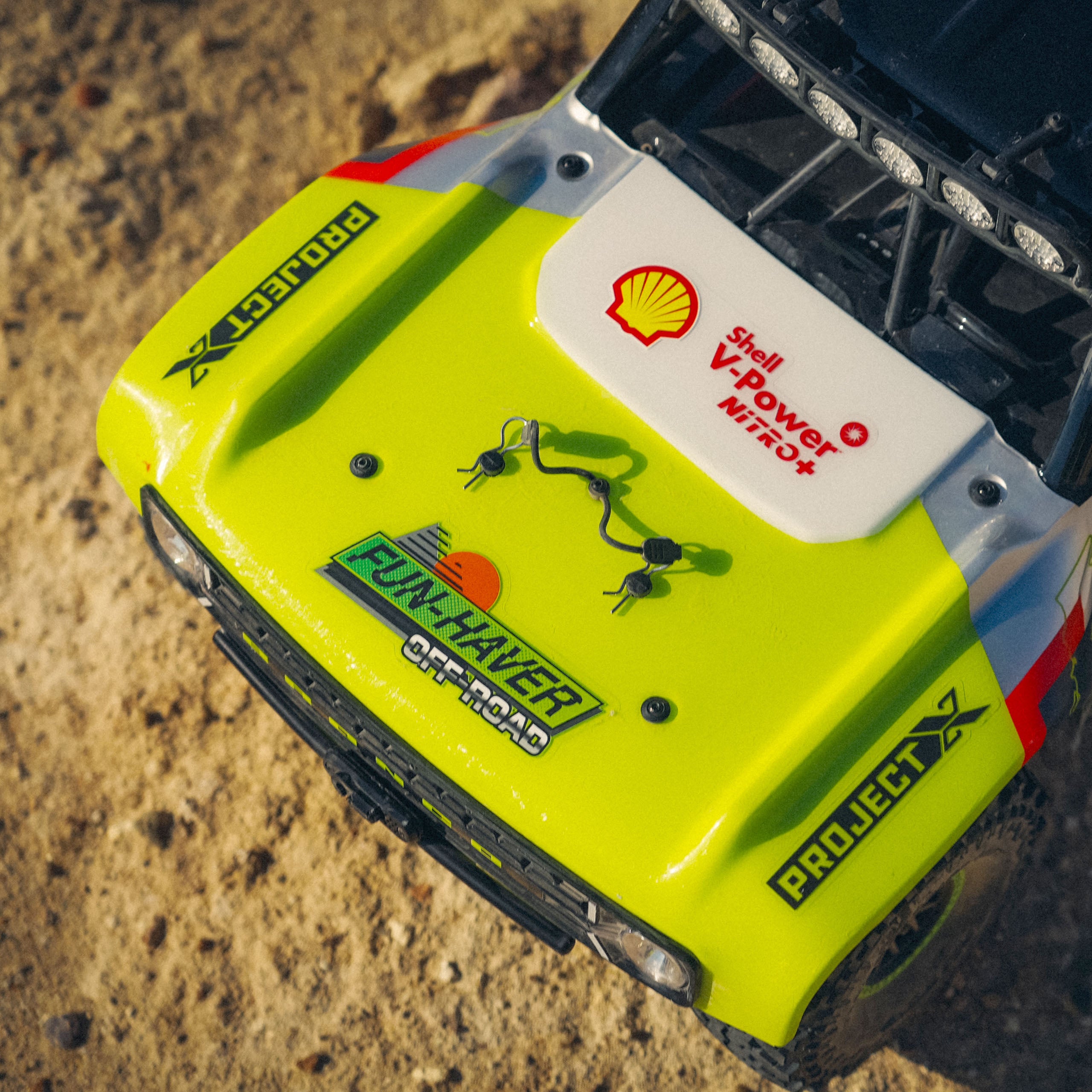 The FMS 1/7 Fun-Haver® Bronco comes in the authentic race livery, designed by the RTR Vehicles Off-Road Team. Featuring fully licensed decals from Ford, Fun-Haver®, Nitto, Shell, FOX, and more. Every graphic is precisely placed to match the full-size truck, delivering true-to-scale style that looks just as aggressive as it drives.