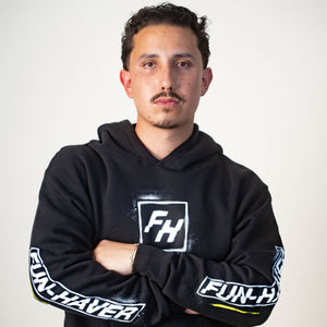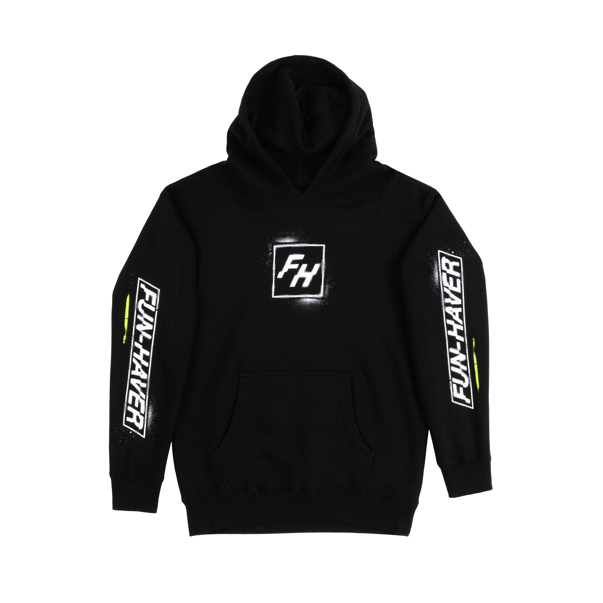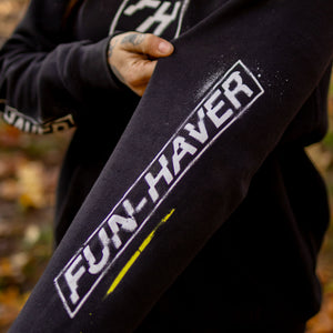 Defy the chill and the status quo with the Stencil Hoodie from Fun-Haver®! This jet-black hoodie is your ultimate layer of rebellion, rocking a bold block FH logo on the chest, splashed in that raw, tag-inspired Stencil style that looks like it was sprayed on a city wall at midnight. The gritty, unrefined Stencil Fun-Haver® design screams down both sleeves, turning every move into a statement.